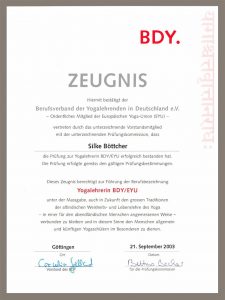 - 1999 – 2002 3,5 jährige Ausbildung zur Yogalehrerin BDY / EYU im Kontaktstudium des Berufsverbandes der Yogalehrenden in Deutschland (www.yoga.de)